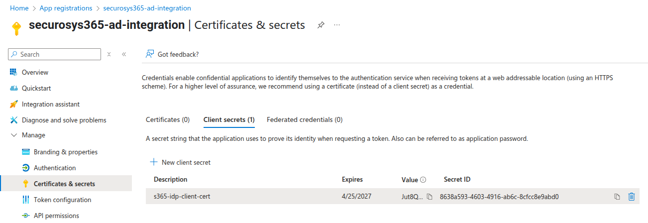 - Copy the Value and paste into Securosys365 - DKE: Client Secret