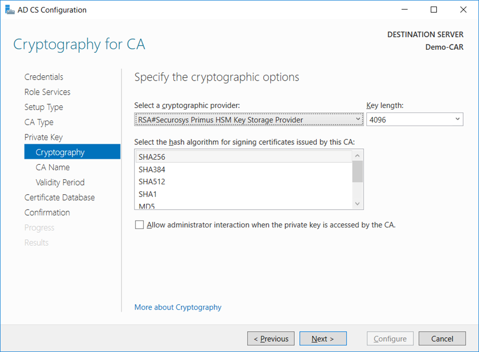 Install-AdcsCertificationAuthority -CAType "StandaloneRootCa" -CryptoProviderName "RSA# Securosys Primus HSM Key Storage Provider" -KeyContainerName myDemoCA -HashAlgorithmName SHA256 -CACommonName myDemoCA