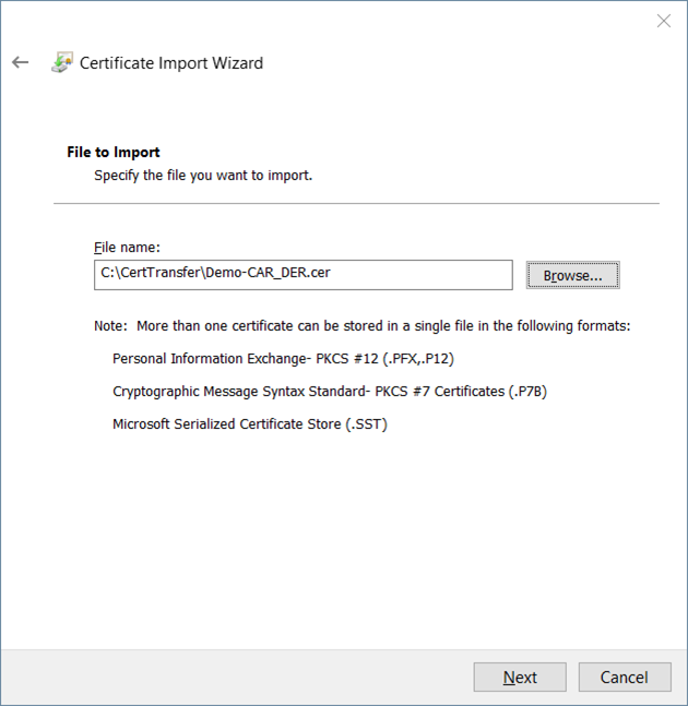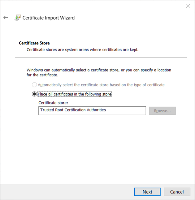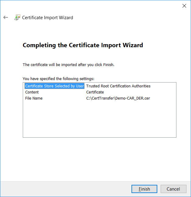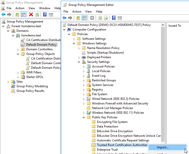 Computer Configurationnode, expandPolicies, expandWindows Settings, expandSecurity Settings, expandPublic Key Policies, right-clickTrusted Root Certification Authorities, and then clickImport...
