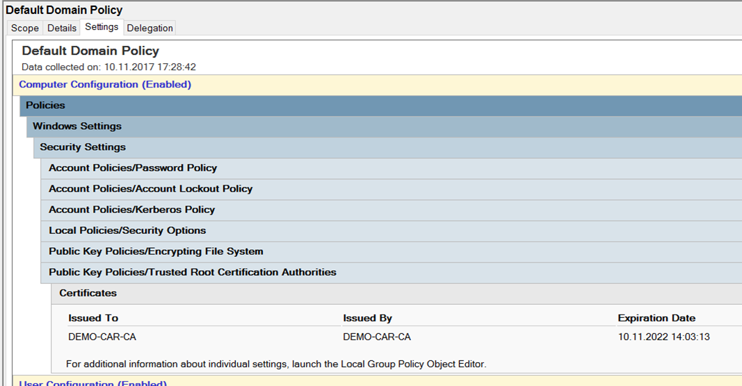 - At this time, distribute the root CA certificate to the domain by importing the root CA certificate into Trusted Root CA of Public Key Policies at an intended domain level GPO, and then the subordinate CA is in place.