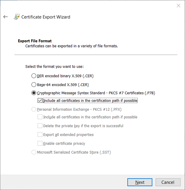 Next, on theExport File Formatpage select the.P7Bformat and check theInclude all certificates in the certification path if possiblecheck box, and clickNext.