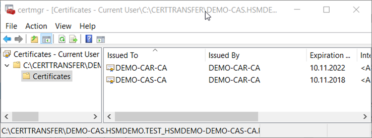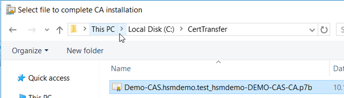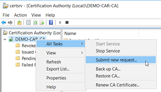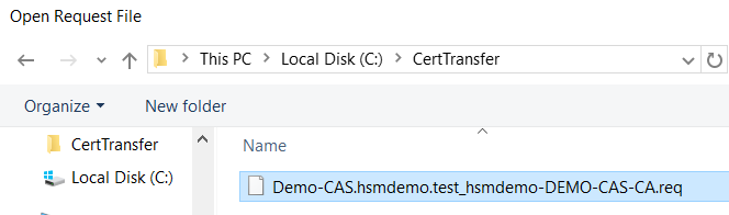 Copy the subordinate CA’s request file .req from the subordinate CA to the root CA for acquiring a certificate in .p7b with complete certificate chain for the subordinate CA accordingly. On the root CA server, open the CA console to submit the request file, Demo-CAS.hsmdemo.test_hsmdemo-DEMO-CAS-CA.req, as shown below.