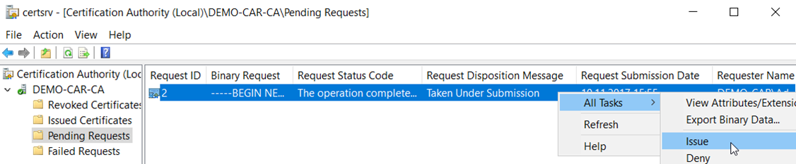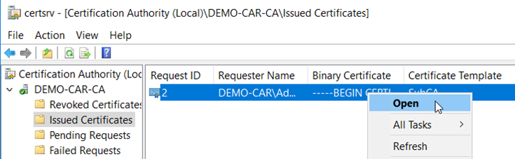All TasksandIssue. Once issued, the certificate will then be listed in the folderIssued Certificates. - Select the issued certificate and click