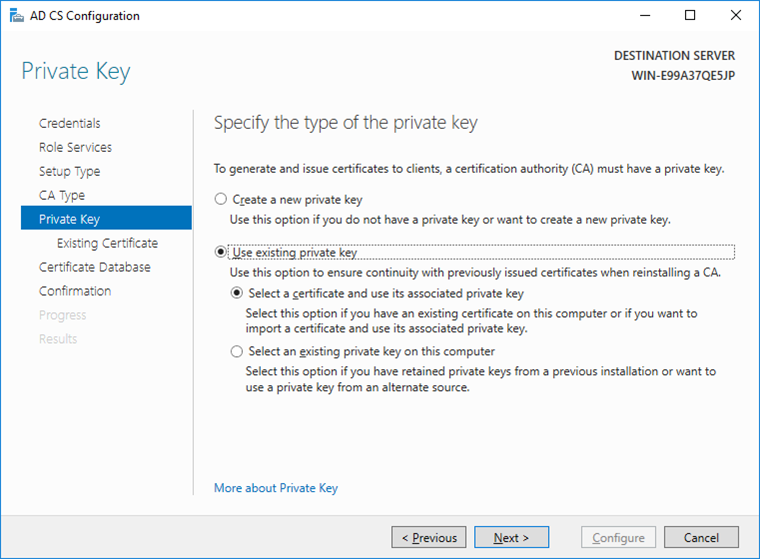 Use existing private keyand the optionSelect a certificate and use its associated private keyand clickNext