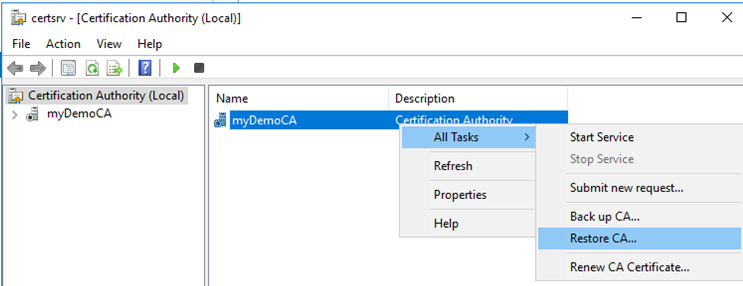 reg export HKLM\SYSTEM\CurrentControlSet\services\CertSvc myDemoCA\myCAregistry.reg