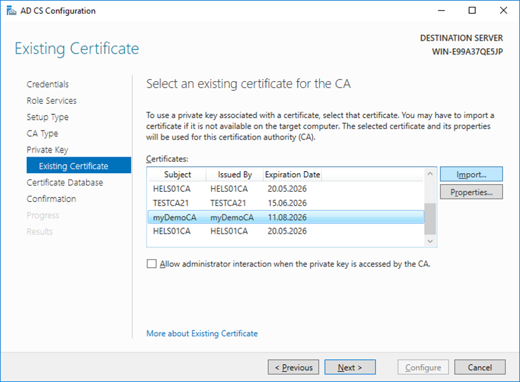 Importin theAD CS Configurationwindow, select the PKCS#12 backup file containing the private key to import and select the imported certificate:
