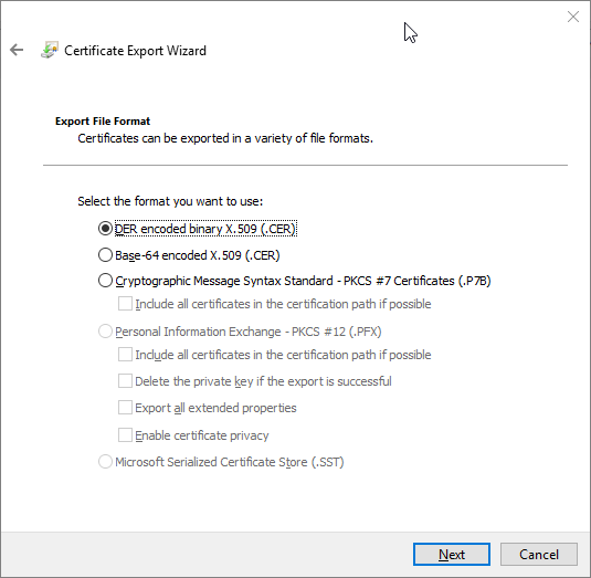 On theExport Private Keypage, ensureNo, do not export the private keyis selected, and then clickNext.