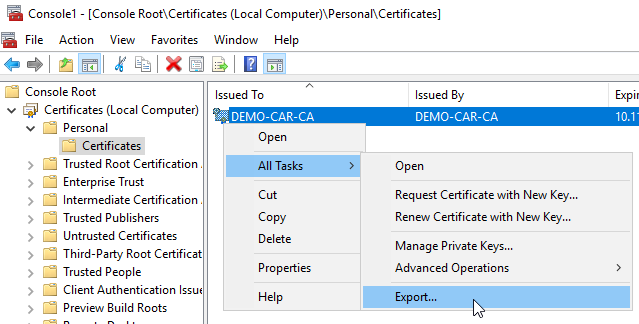 Explorerpane, expandCertificates – Local Computer, Personal, Certificates. - Select the RootCA certificate, and the on the Action menu, click