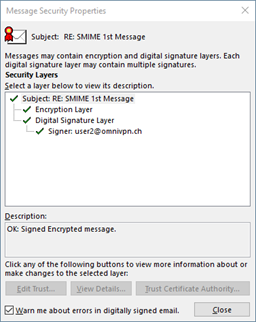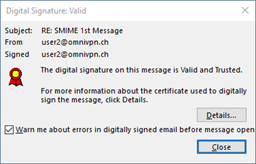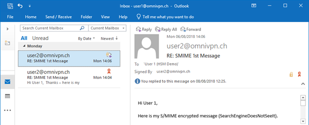 S/MIME protection is marked with icons within the Outlook client, indicating if the message is signed and/or encrypted.