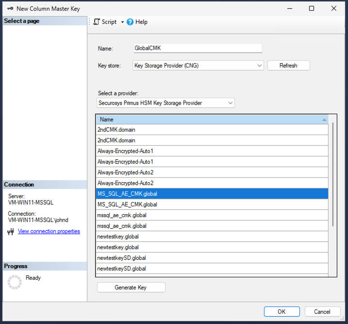 Securosys Primus HSM Key Storage Providerprovider and then select your previously created global key (in our example we useMS_SQL_AE_CMK.global) from the list of keys stored on the selected KSP.