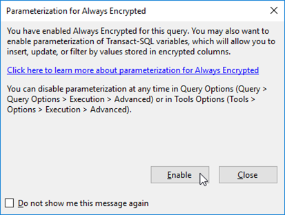 The first time you query the database you may get the Parameterization for Always Encrypted prompt. Click on Enable to proceed.
