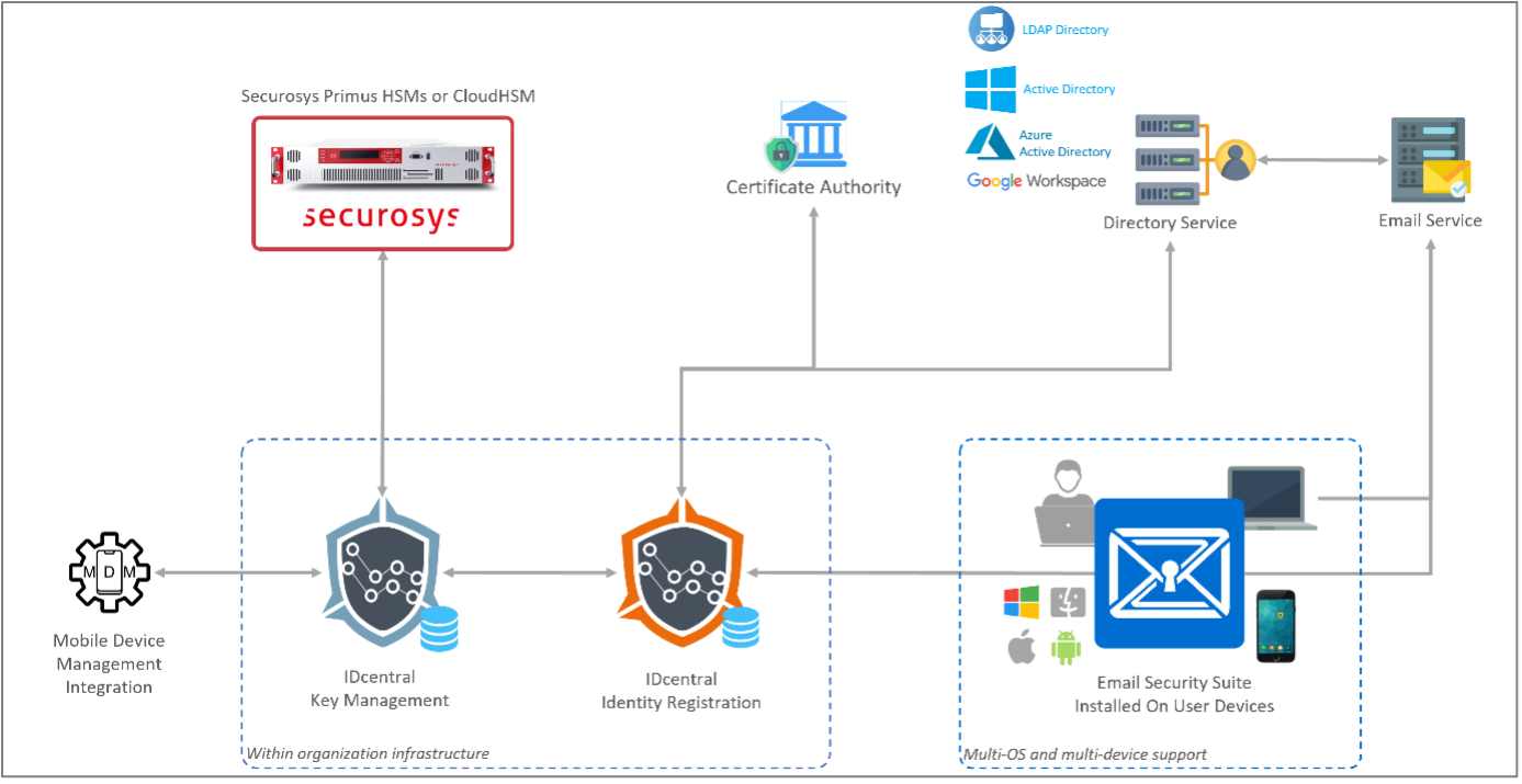 Sixscape’s IDcentral Key Management Platform with Securosys' Hardware Security Modules (HSMs) allows to securely escrow S/MIME encryption key pairs using the Sixscape:
