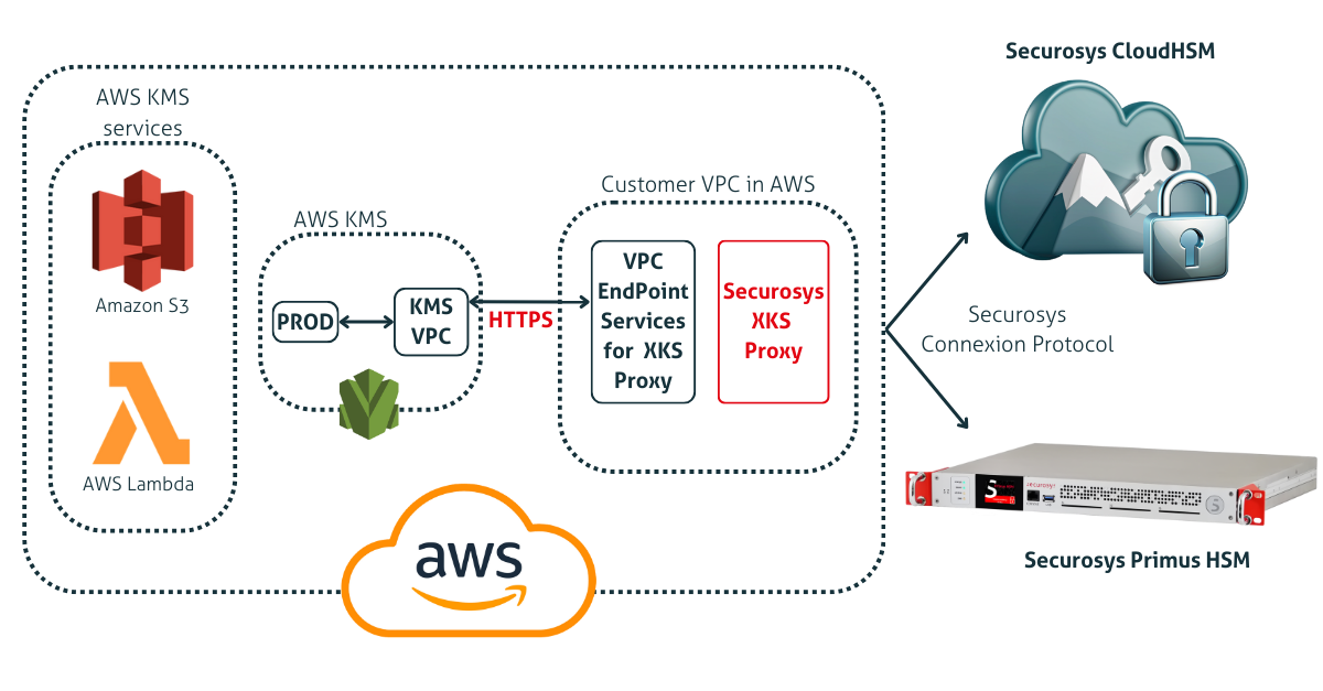 All communication between AWS External Key Store and the HSM is facilitated through the Securosys XKS proxy.